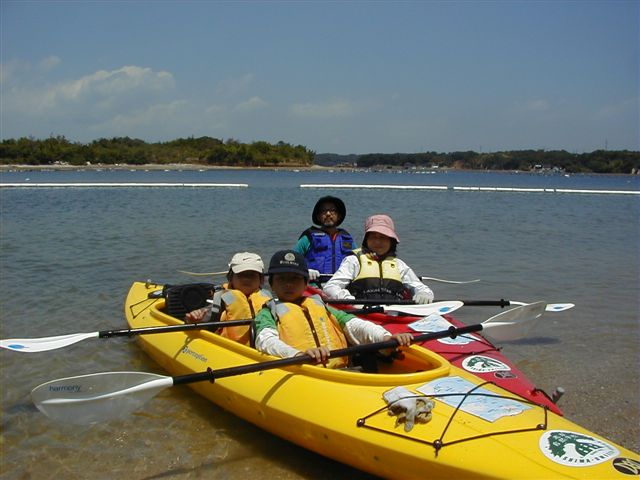 学校の車で、普通は車で入れない人工の砂浜までゲートをパスして降りる。で、軽い準備体操の後、シーカヤック無人島ツーリングのスタート。基本はだいたい川下りと同じ。ただし、パドルは、90度クロスせず、左右同じ方向を向いている(アンフェアリング)。遠泳のイメージで、大きく、ゆっくりと漕ぐのがコツのようだ。