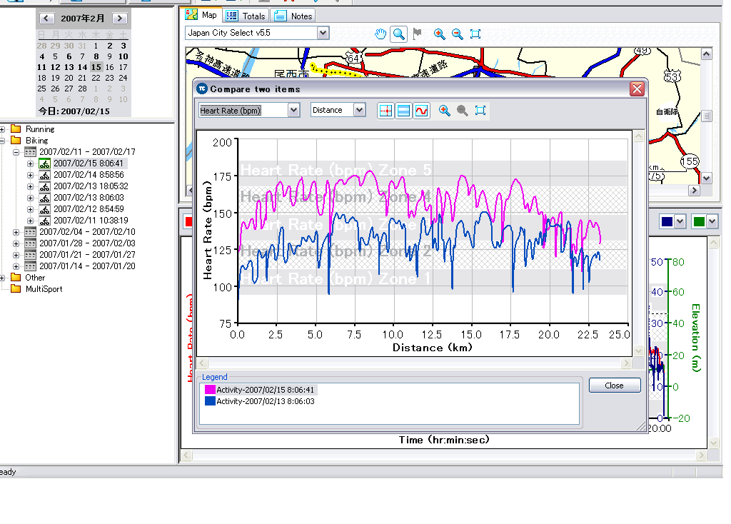 (ピンクが今日の心拍、青が一昨日。横軸は距離にしてある)