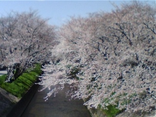 岩倉市内の五条川では桜がほぼ満開。桜祭りは4月10日まで、と看板にある。