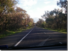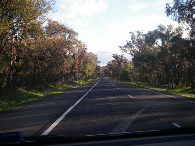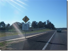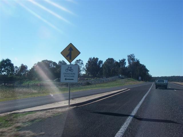 結局メルボルン?シドニーの中間地点のオーベリまで、サイクリストを見ることはなかった。雨が降ったりやんだりの変な天気。草原の中をアップダウンを交えながら110キロでクルーズ。道路の両脇に木立。ときどき、コアラ横断に注意の看板。