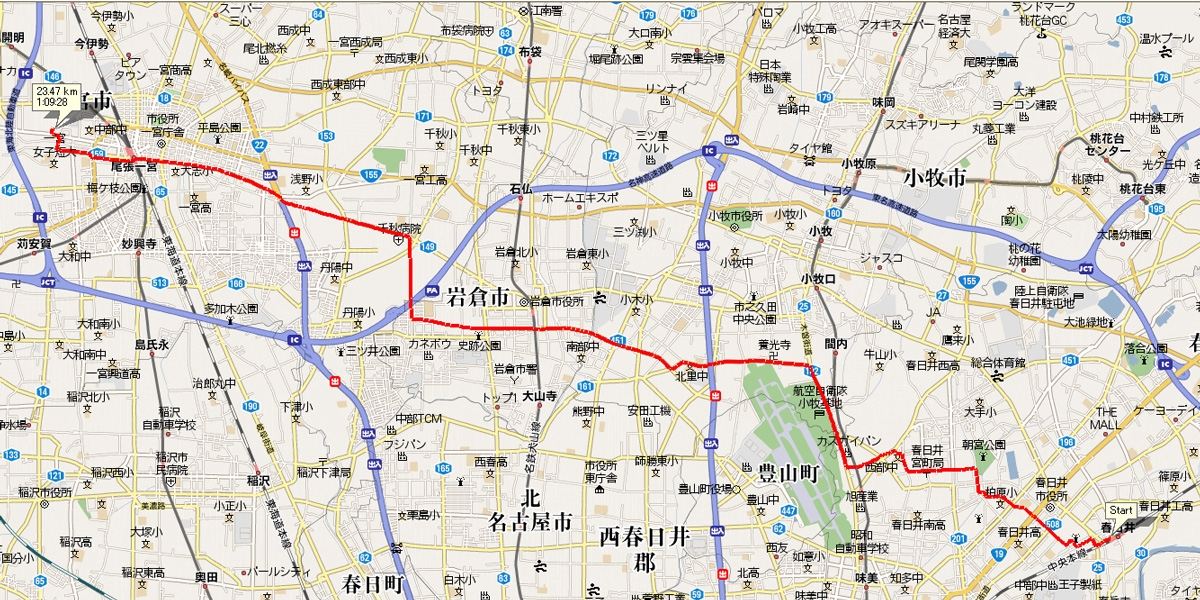 通常の自転車通勤ルートは空港の北側を通って岩倉を抜けて、旧電車道をぬけて、起方面へ。自転車の置いてあるJR春日井駅前駐輪場から、勤務先の一宮市まで片道23.5km、1時間10分位。