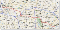 水分橋まで1時間ぴったり、23.5キロといつもの距離。そのまま八田川沿いの自転車道にはいる。ただし、この自転車道は歩道兼用の上、車道との交差が多く、一旦停止を強いられる。交差する道路は交通量も多く、なかなか反対側へ渡れない。結局車道へ。地図はEdge305のログをSportstrackに読み込んで表示(クリックで拡大表示されますが、地図の移動は出来ません)