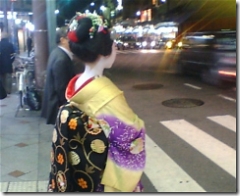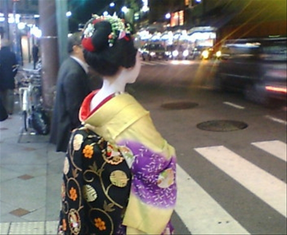 地下鉄の駅で、既知のA工業大学のセンセイに散策しようと声をかけられて、ご一緒することにする。祇園をあるく、という。多少酔っぱらっていても、足には自信がある。工学系の汗くさいと言うよりは、インテリくさい男子学生たちと紅一点さんに囲まれ、決してロマンチックに、とは行かないが、祇園を歩いてみる。舞妓さんを見つけて、一枚写真。