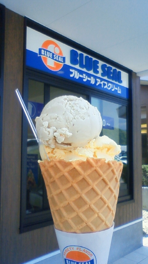 写真は外出時に養老インターで見つけた沖縄名産、ブルーシールアイス。何年か前に沖縄で落車して、1ヶ月ほど病院で南国料理とバカンスを楽しんだとき、何回もお世話になった。サトウキビを使っていて、外国ブランドの脂肪分べっとりのアイスとはひと味違うおいしさ。まさかこんなところで会えるとは!帰りにももう一度食べたいと思って養老インターに寄ったが、下りにしかなかった。