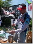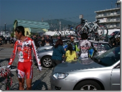 駅前広場では、選手達が集まって、エントリーやら取材やら。むこうから、DADDYの店長が歩いてきた。去年までは一緒に観戦したが、今年はMOVICのニュートラメカのサポートで、黄色い車に乗り込む事になっていて、観戦は無理。