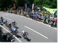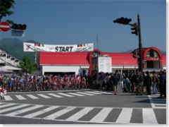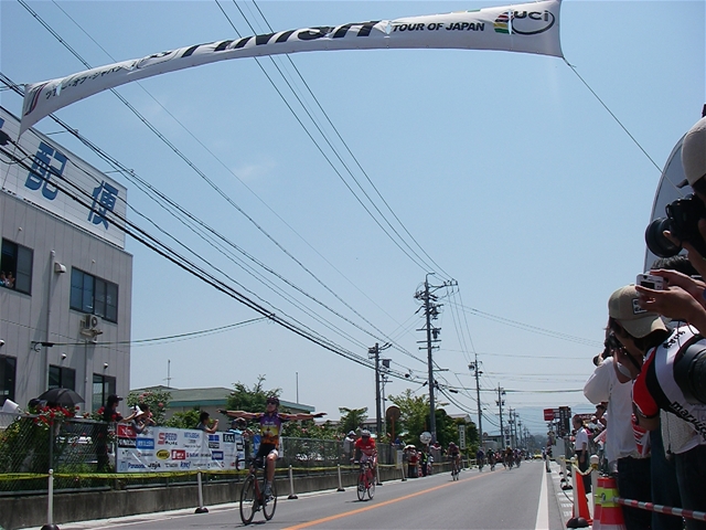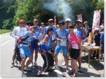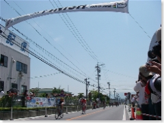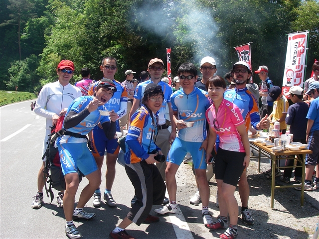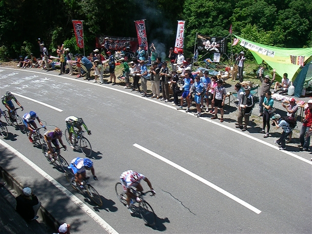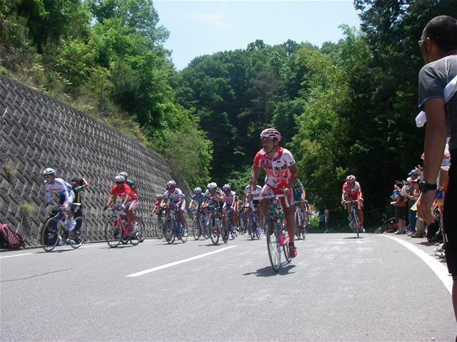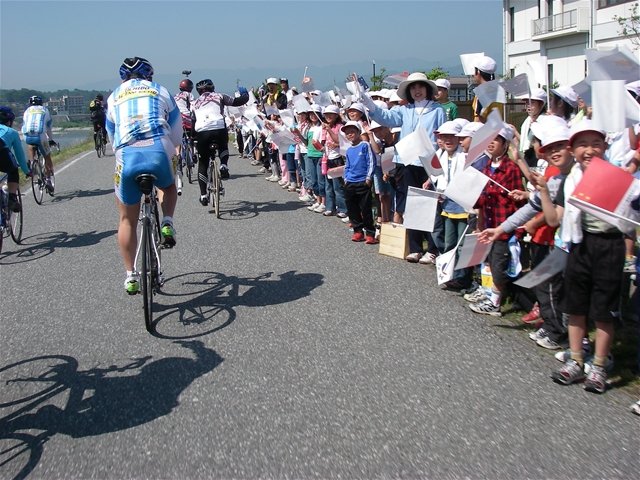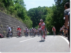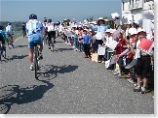 駅前から堤防にかけて、ものすごい声援。チームウェアで参加したので、子供達には同じ選手に見えたのかも。当然、その気になって手降って声援に応える。水神橋で一端解散し、その後直ちに山岳ポイントへ、ご一行様で移動。毎年けんかのようになってしまう水神橋もボンシャスの先導で、非常にスムーズに通過する。もっとも、斜度は10−15%と決してスムーズには登れない。