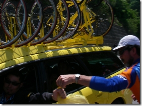 坂隊隊長は「匂いだけを届ける」予定だったが、差し入れも有ることだし、約束通り、お仕事をしている店長に焼き肉とビールの差し入れ。もっとも、山岳ステージのサポートカーの運転は想像に難くない。最小限の差し入れ。ミラーがじゃまだったが、無事受け渡し成功。