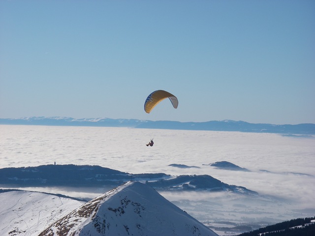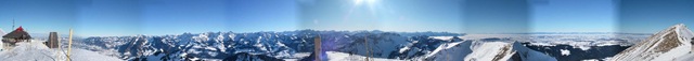 ケーブルカーで上ればわかる、という。スキーヤーに囲まれて、3人でケーブルカーに乗り込む。仕事靴とジョギングシューズしかなかったので、ジョアキムのスイスアーミーシューズを借りる。IMGP4030 ぴったり!ちなみにスイスは国民皆兵制度を採っているので男子はほぼ全員この軍隊靴を持っているらしい。 3人で60フラン程。永世中立国というだけあって、経済もユーロ圏には組み込まれなかった。ケーブルカーの後はさらにロープウェイを乗り継いで、一気に標高2000mまで。市内でもマイナス15度だから、恐ろしい天気を想像したが、これがめちゃくちゃ気持ちいい。こんなパノラマビュー。