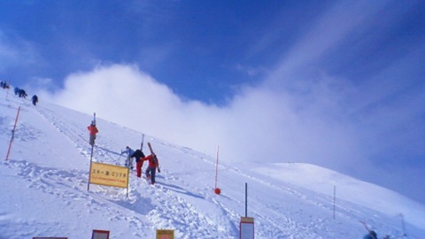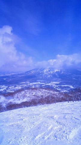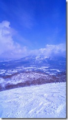 昼過ぎには、小雪もやんで、快晴。となりの羊蹄山も頭をのぞかせる。一番上のリフトを登り切ると、ニセコアンヌプリの山頂もはっきり見える。(写真の右がピーク)リフト最終点から、20分ほどで担いで登ると1308mのピーク。リフトはないものの、部分的に圧雪してあるから小さな板でもOK。登りたかったが、腰の様子を見て、今日はやめておく。 休憩なしで、3時過ぎまで滑る。(リフトで補食。)。主に、非圧雪のパウダー中心。最初転びまくったが、何とかコツが飲み込めた。抜重を派手にやる、板はそろえたまま、派手にテールを押し出す。速度がでないので、直滑降に近いルートを選ぶ。これでだいぶ滑れるようになった。