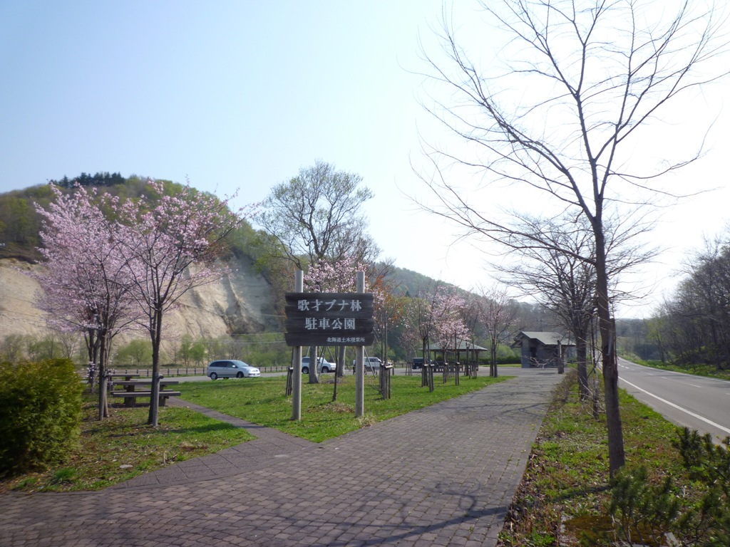 こどもの日。8時過ぎにFKMTさん宅に向かう。途中の歌才ぶなの森 入り口付近にある駐車場。桜が8分咲き。