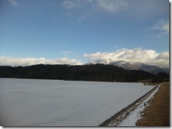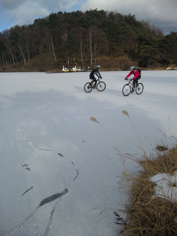 900mの鞍部でなんとか追いつく。この先は、激坂区間だが、部分凍結。とても乗れたモノではない。押しで進むが、それでも何度か転倒しそうになる。あくまでも慎重に進む。ピークまで1:01。この条件下では結構なハイペースだ。そのまま根ノ上湖へ。 全面凍結。小動物の歩いた後がある。堤堰の雪は溶けているが、タイヤが埋まって異常に重い。