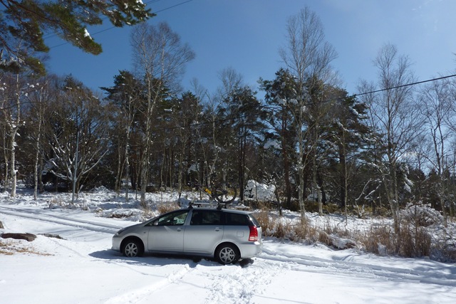 P1050389 筋肉痛。日曜日のチーム練習は諦める。ネットワークのカメラをあれこれいじるがどうしようも無い。家内と相談して、午後根ノ上に車であがり、私はスキーを、家内は散策をすることで合意。ところが直後にMr王滝から、雪中ダウンヒルのお誘い。MTBで源根林道を上り、シングルで降りるという。