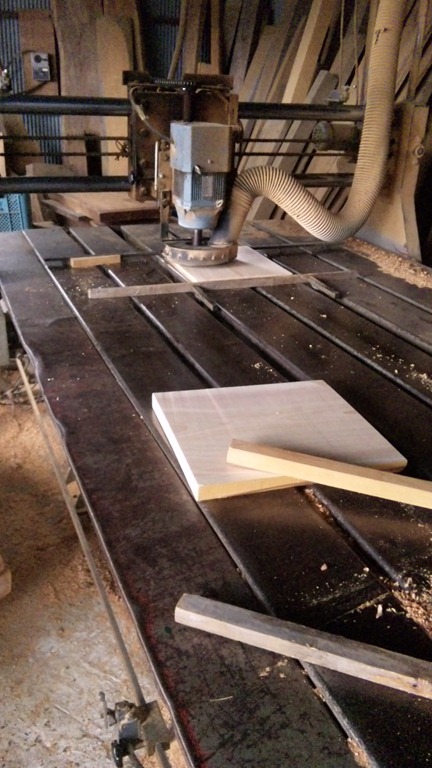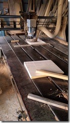 まずは座面の加工。工場の電ノコで幅39センチ厚さ30ミリの板を瞬断。ボタンを押すと3秒で切れちゃう。さらに一旦かんなをかけて、巨大なNCマシーンを使って平らな板にしてもらう。我が家のテーブルを作るのにも活躍した、ウワサの一台である。