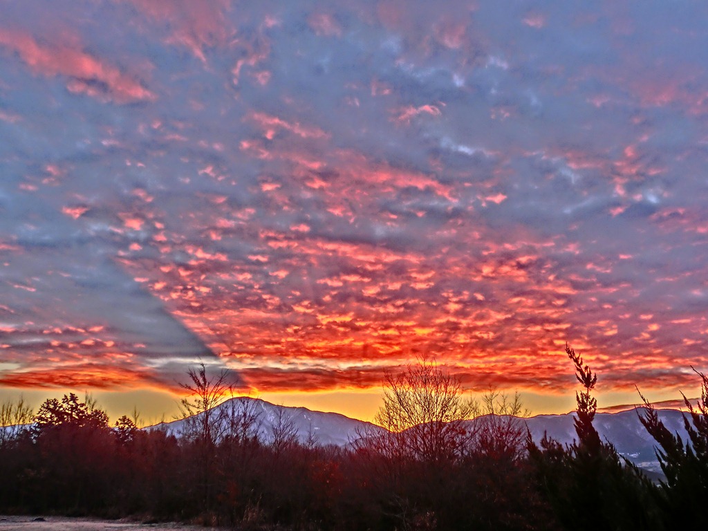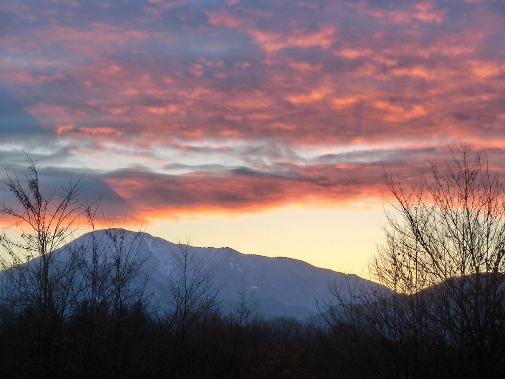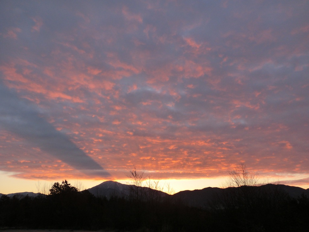 CIMG0355美しい朝焼けだった。恵那山の山頂の陰が、雲に伸びている。この様子からすると、雲は恵那山よりこっち側で、長野県側ははれているのか?