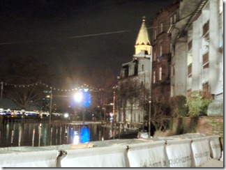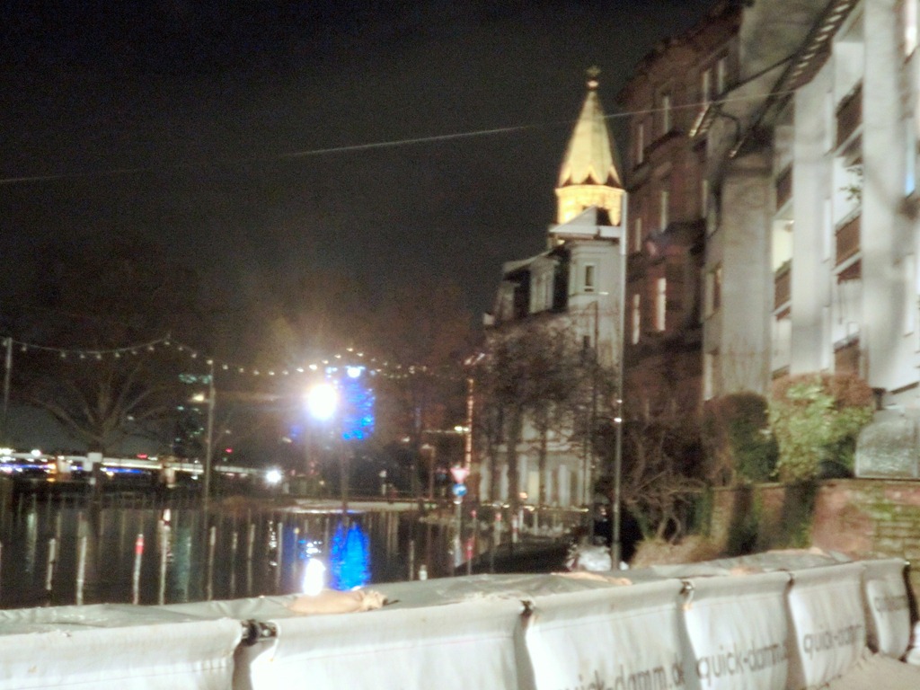 晩ご飯は同僚+元同僚とフランクフルトの旧市街へ。週初めにマイン川では、川がかすかに道路にあふれて、残り30センチで市街地という状況だったが、1週間ほどで、道路は完全に水没。土嚢を積み上げて浸水を防いでいる状況となった。消防車、発電車が動員されており、照明の向こうに、流れの速くなった濁流が見える。写真は川下方向を撮ったもの。ISO3200でシャッター速度は1/8秒。肘をついてセルフタイマーはなし。暗い部分のディテールが残っている。手前の白もつぶれていない。HDRの技術はすごい。(少しレタッチ)